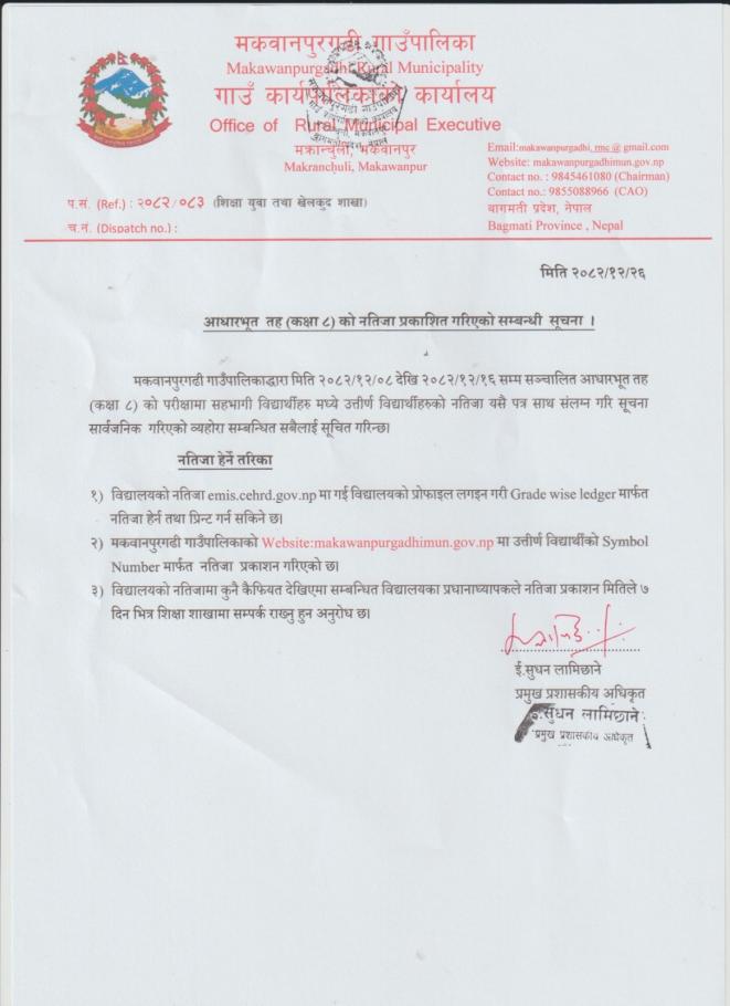 आधारभूत तह (कक्षा ८) को नतिजा प्रकाशित गरिएको सम्बन्धी सूचना