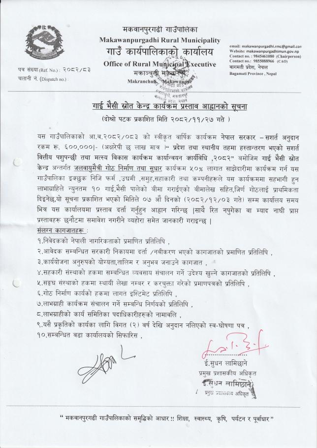 गाई भैसी श्रोत केन्द्र कार्यक्रम प्रस्ताव आह्वानको सूचना। (दोस्रो पटक प्रकाशित मिति २०८२/११/२७)