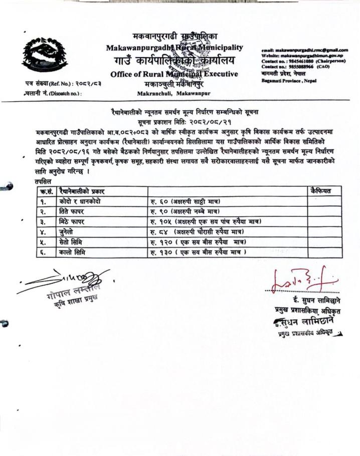 रैथानेबाली न्यूनतम समर्थन मूल्य निर्धारण सम्बन्धीको सूचना।