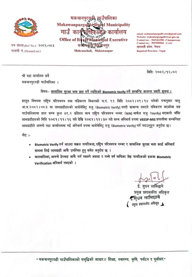 सामाजिक सुरक्षा भत्ता प्राप्त गर्ने व्यक्तिको biometric verify गर्ने सम्बन्धि अत्यन्त जरूरि सूचना।