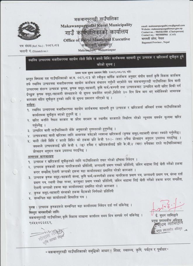 स्थानिय उत्पादनमा बजारीकरण सहयोग (सेतो सिमी र कालो सिमि) कार्यक्रममा सहभागी हुन उत्पादक र खरिदकर्ता सूचीकृत हुने बारेको सूचना।