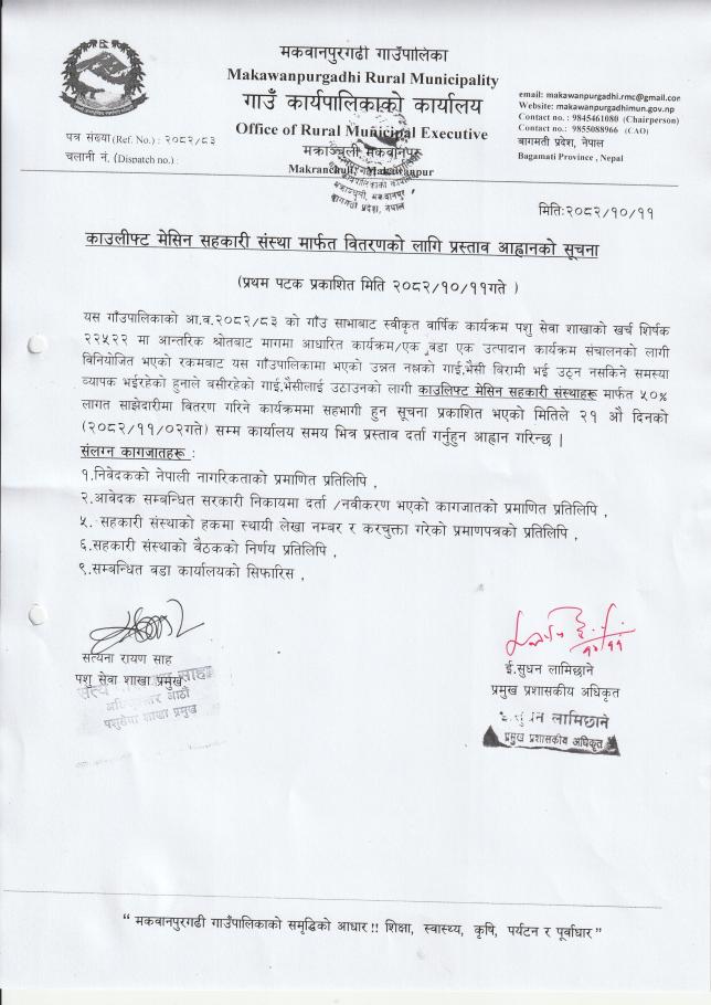 काउलीफ्ट मेसिन सहकारी संस्था मार्फत वितरणको लागि प्रस्ताव आह्वानको सूचना।