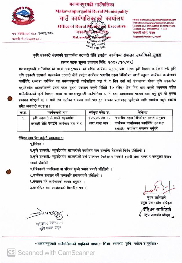 कृषि सहकारी संस्थाको सहकार्यमा तरकारी खेति प्रवर्द्धन कार्यक्रम संचालन सम्बन्धीको सूचना।