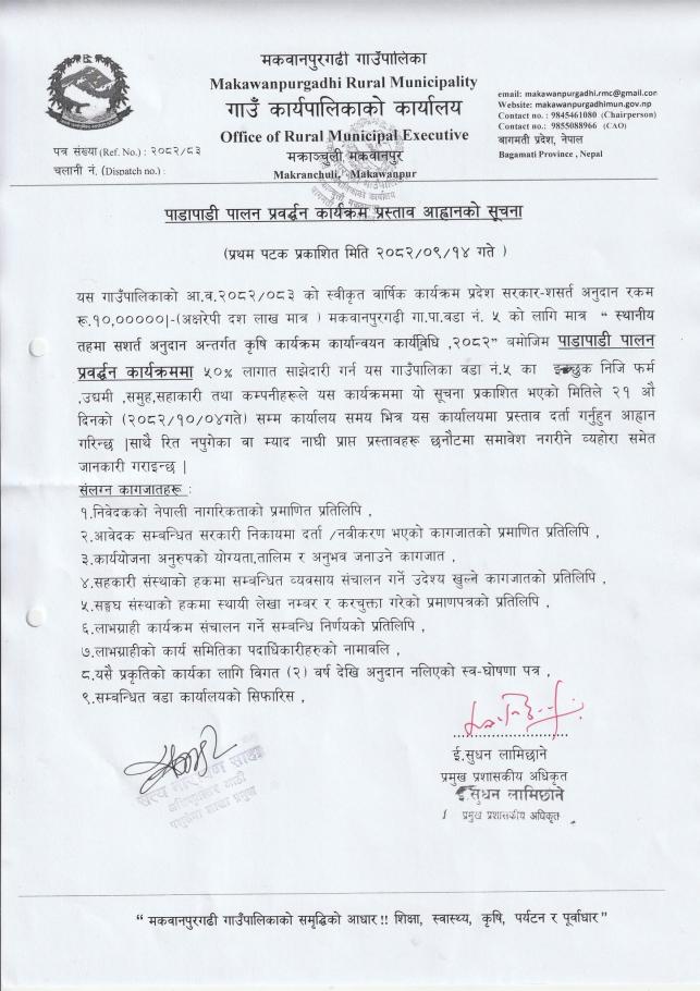 पाडापाडी पालन प्रवर्द्धन कार्यक्रम प्रस्ताव आह्वानको सूचना।