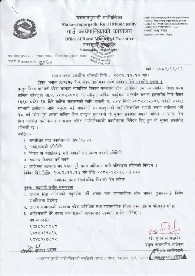 बनाना ह्याण्डमेड पेपर मेकर तालिमका लागि आवेदन दिने सम्बन्धि सूचना।