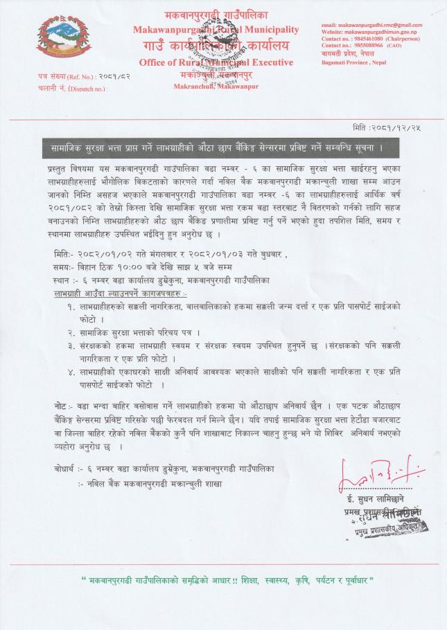 सामाजिक सुरक्षा भत्ता प्राप्त गर्ने लाभग्राहीको औठा छाप बैकिङ्ग सेन्सरमा प्रविष्ट गर्ने सम्बन्धि सूचना।